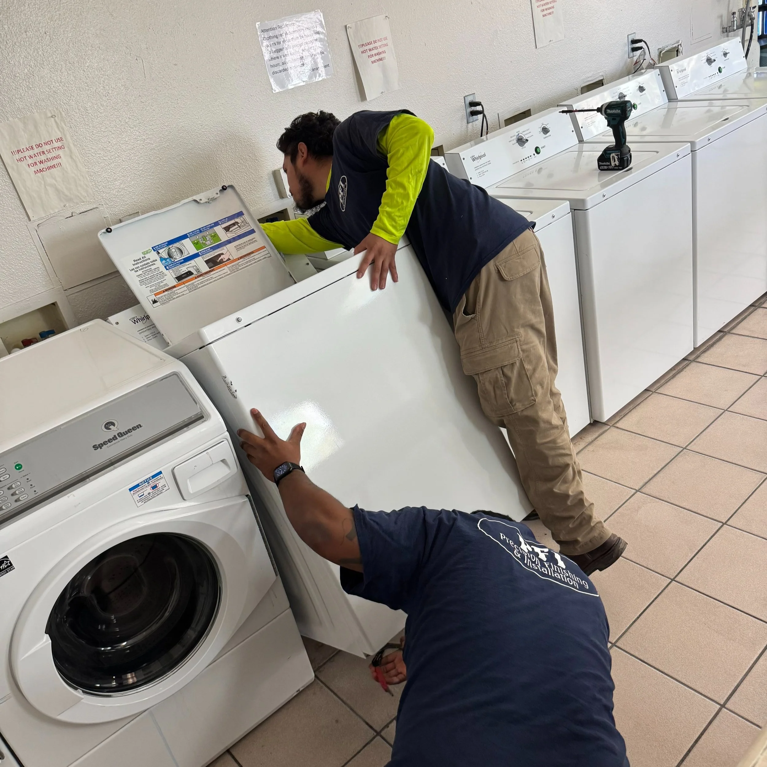 Two technicians repairing a row of washing machines in a laundry room. One is examining inside a machine while the other crouches nearby. Tools are visible on a machine top. The space is tiled with informational signs on the wall.